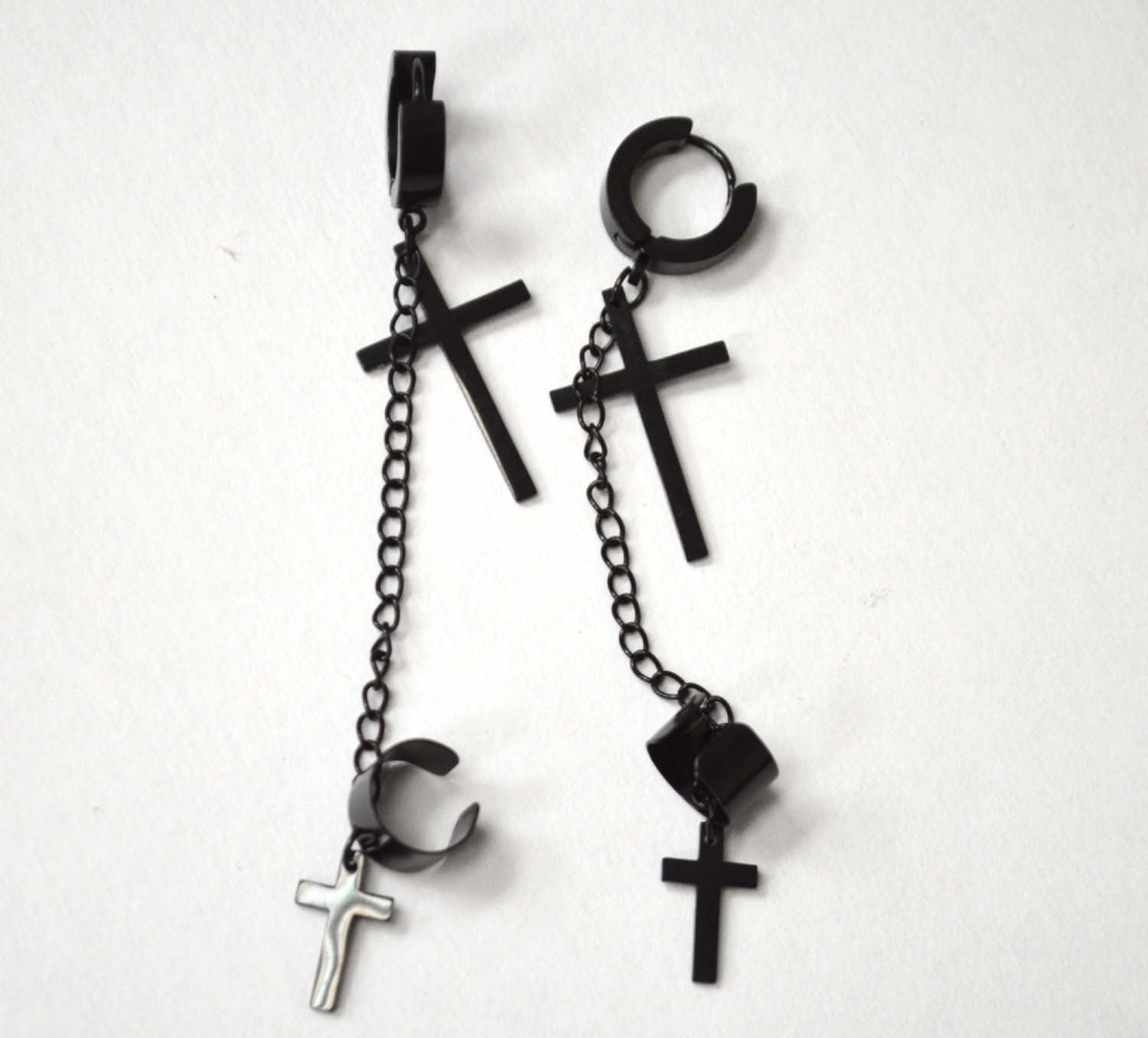 Cross Dangling Huggies/Earcuff Black Plated Earrings 83-855B