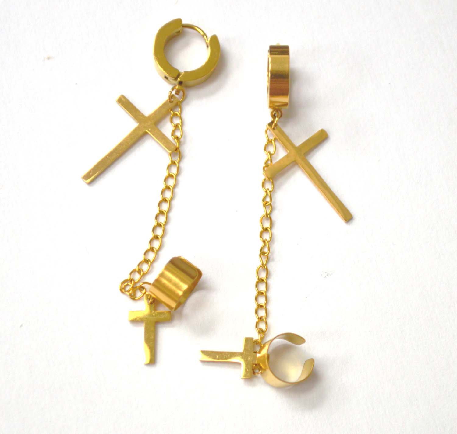 Cross Dangling Huggies/Earcuff Gold Plated Earrings 83-855G